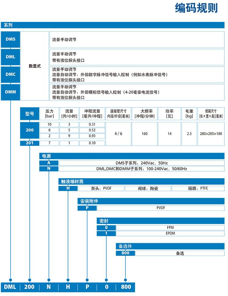 KomBa系列電磁隔膜計量泵- 計量泵DMS200是一款基于微處理器控制的數顯式電磁隔膜計量泵,具有操作簡單、運行穩定的特點。包括4個子系列:DMS系列計量泵, DML系列計量泵, DMC系列計量泵DMM系列計量泵。